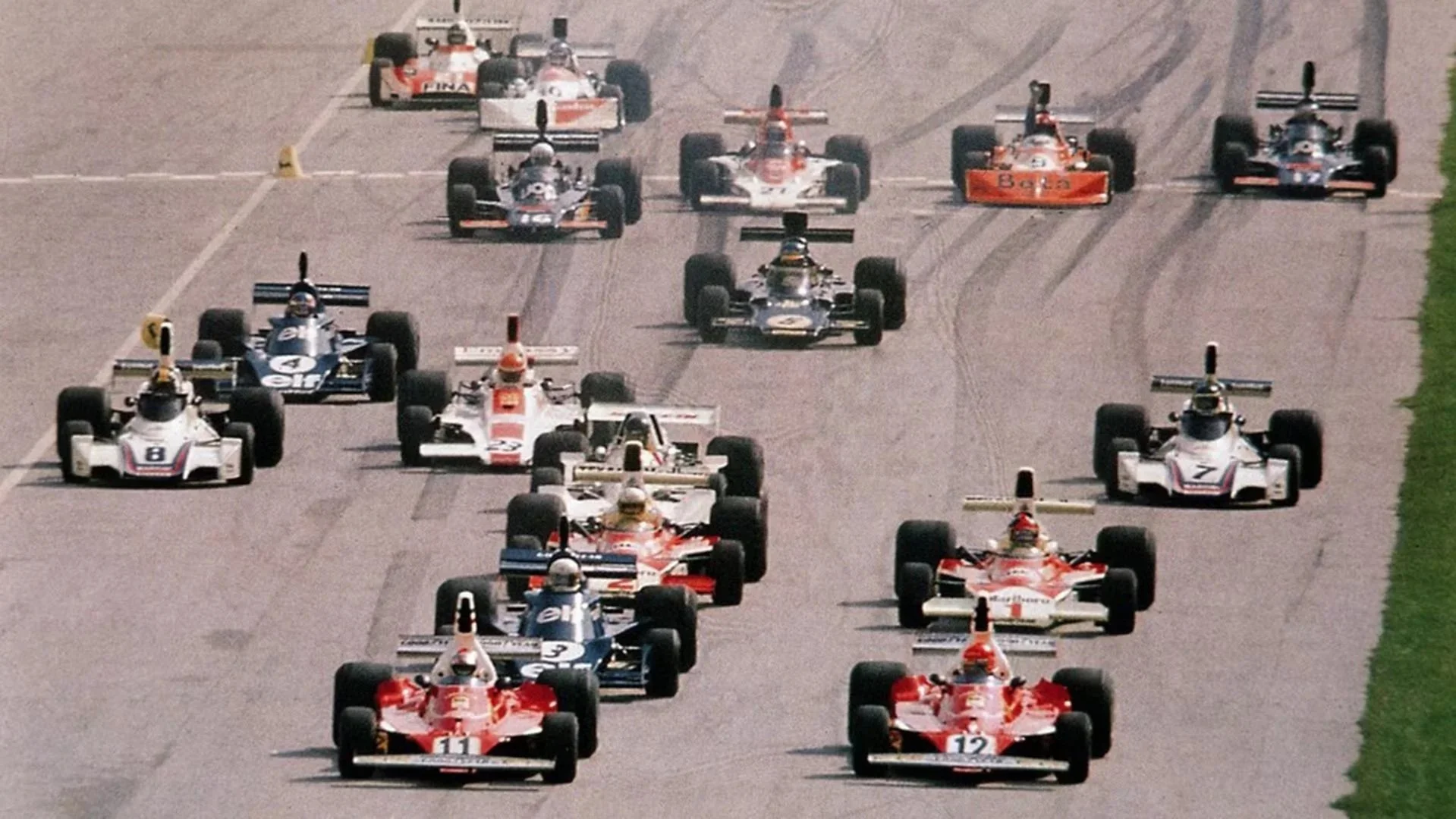 Behind him, Regazzoni made it a Ferrari one–two, while Fittipaldi’s McLaren faltered with fading grip.